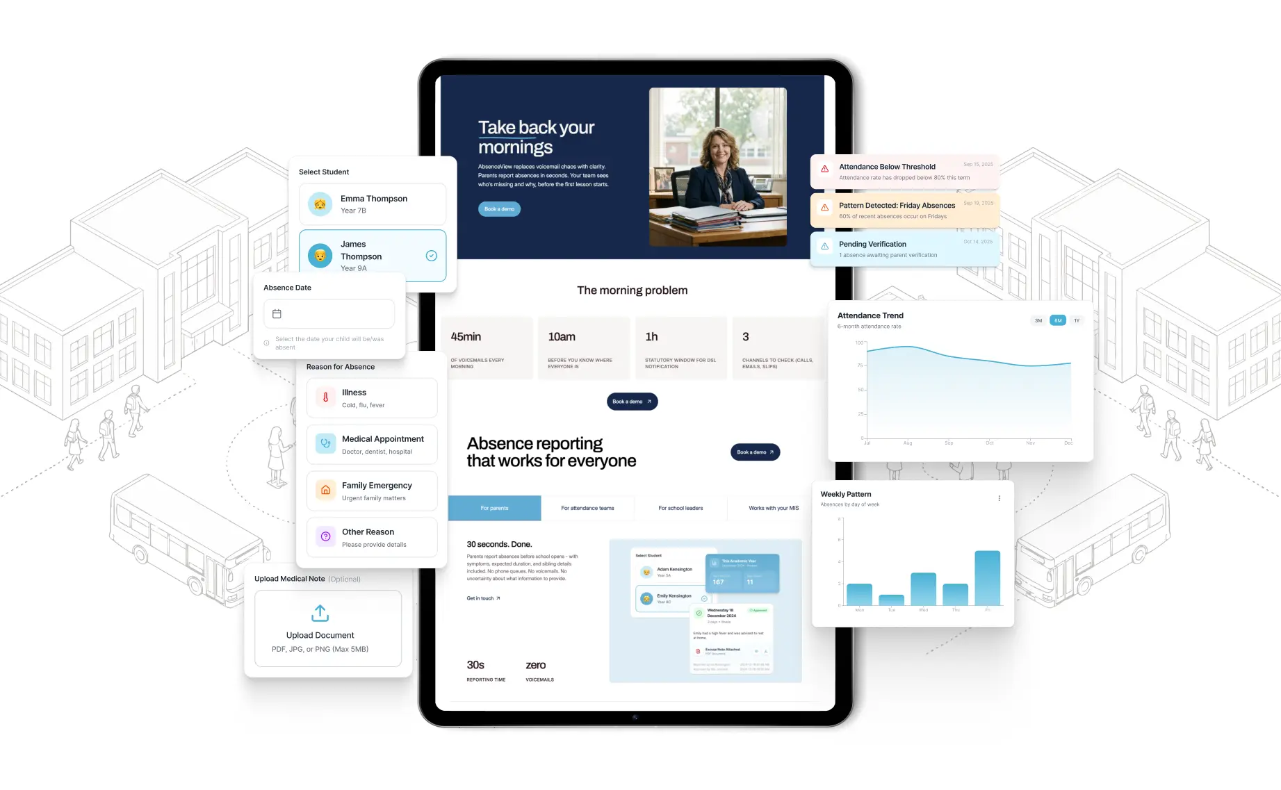 Before designing anything, we helped Lee structure interviews with potential customers to understand their real pain points. From those conversations, we identified four distinct audience segments – attendance officers drowning in morning admin, head teachers focused on operational efficiency, pastoral leads needing faster safeguarding visibility, and parents wanting a simple reporting process.